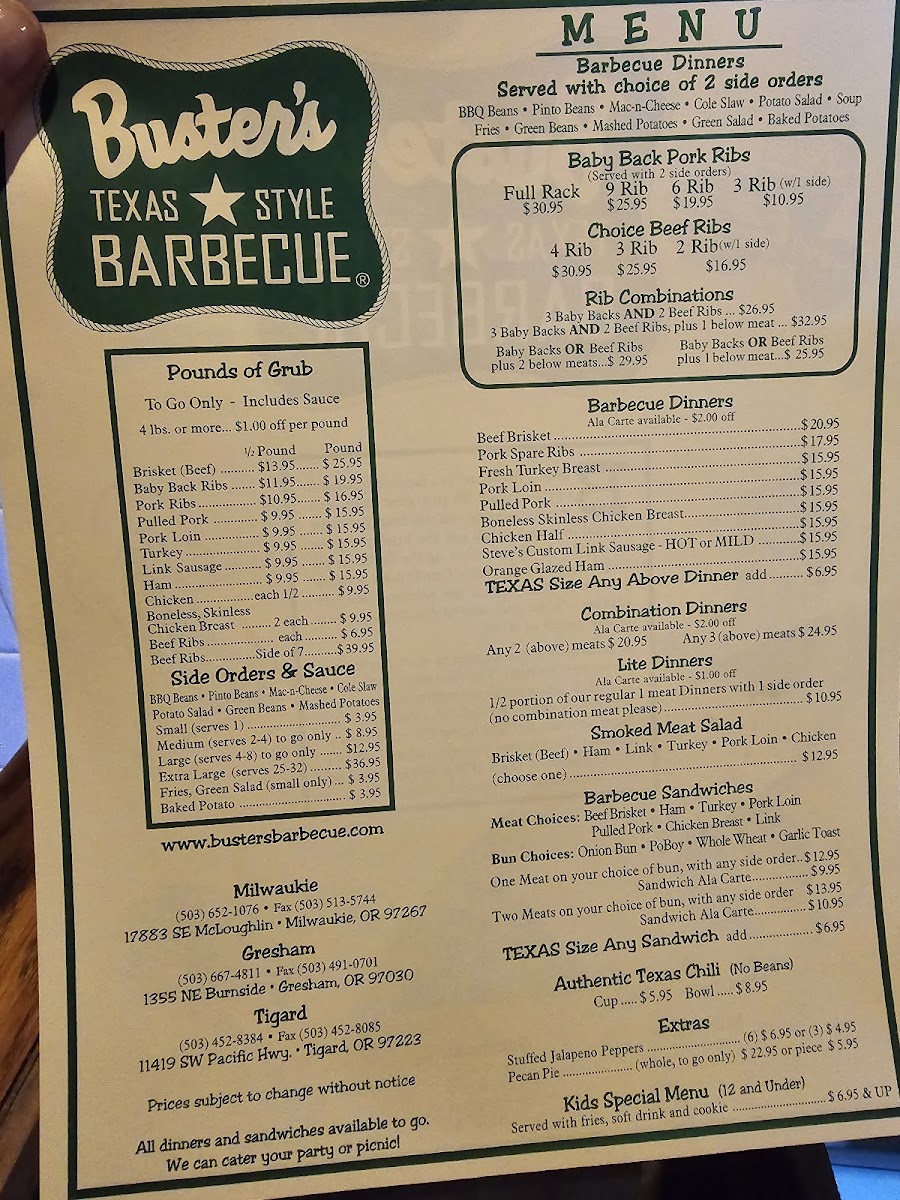 Welcome to Buster's Texas-Style Barbecue, a hidden gem located at 11419 SW Pacific Hwy, Tigard, OR. This barbecue joint has curated a fantastic reputation for delivering authentic Texas-style barbecue that satisfies both the palate and the heart. With a mouthwatering menu that features everything from tender brisket to savory pulled pork, Buster's stands out as a must-visit for barbecue enthusiasts.